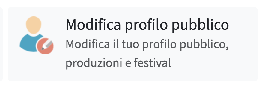 Se rappresenti un'organizzazione, una compagnia teatrale o un ente, la sezione profilo avrà campi specifici per le realtà collettive. Ricorda che solo questo è il profilo pubblico che sarà inserito nella directory dei producer o dei programmer alla voce network. Il profilo personale invece non è pubblicato. Cliccando su tasto "Modifica il profilo pubblico" stai dunque per aggiornare il profilo dell'azienda/compagnia collegata.